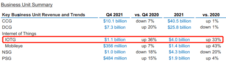 在晶圓代工巨頭臺(tái)積電公布的財(cái)報(bào)中,2021年其手機(jī)業(yè)務(wù)營收首次被HPC(大型高性能計(jì)算)業(yè)務(wù)超越,面向汽車板塊的營收和訂單需求也猛增。 圖像傳感器芯片設(shè)計(jì)龍頭韋爾股份最新財(cái)報(bào)顯示,其半導(dǎo)體業(yè)務(wù)收入同比增長18%,雖然智能手機(jī)CMOS占據(jù)營收大頭,但業(yè)績?cè)鲩L主要來源于車載CIS與安防CIS,尤其在安防領(lǐng)域?qū)崿F(xiàn)高達(dá)60%的業(yè)績?cè)鲩L。 2021年物聯(lián)網(wǎng)事業(yè)部(IoTG)成為國際半導(dǎo)體巨頭英特爾增長最快的業(yè)務(wù),同比增長33%,同時(shí)汽車自動(dòng)駕駛業(yè)務(wù)也增速驚人,反觀主營PC終端的CCG部門業(yè)績僅增1個(gè)百分點(diǎn)。